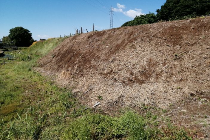 ここの現場は柔らかく崩れやすい土質だったので、客土※し、スコップ等で転圧作業もしました。