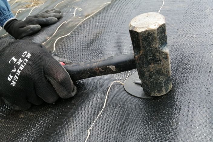 シートを延長方向に敷設し、固定ピンを打設していきます。