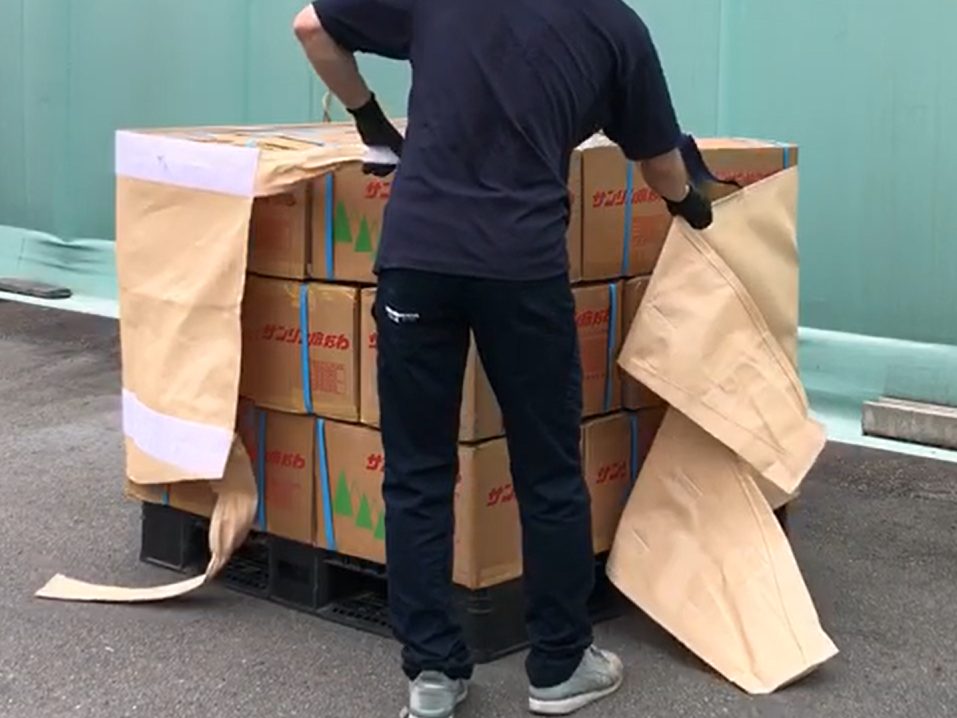 とくにパレットの上に重袋や段ボールを段積みした場合、個々の荷物が異なる挙動をすると荷崩れが起こります。