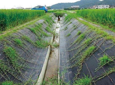 防草効果と 地被植物活着 効果で畦畔管理の省力化につながる「べた~とシート」。