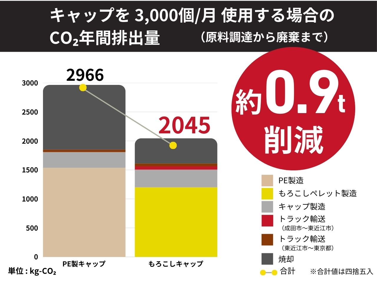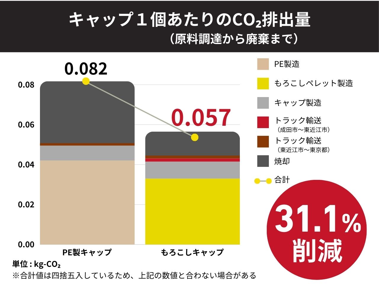 「もろこしキャップ」は従来PE製キャップよりも、石油由来プラスチックの使用量が少ないことと、焼却処理にカーボンニュートラルによる相殺が適用されることが、CO₂排出量の差となりました。
