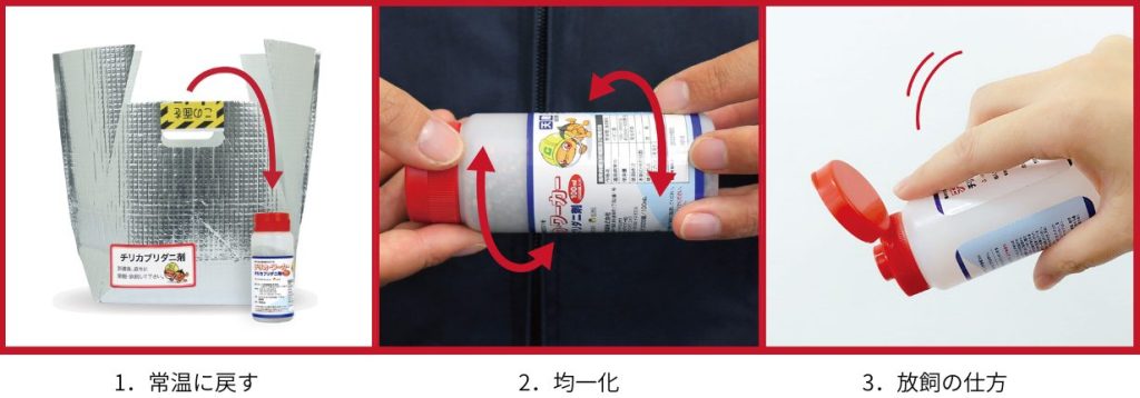 - 均一化:チリカブリダニは上に集まる習性があります。均一に放飼する為に、放飼する前に、ボトルを横にして回転させてください。